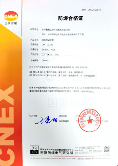 徐州鑫友工控科技發展有限公司消防電動裝置獲防爆合格證