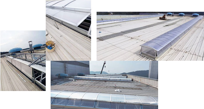 2. 圓拱型電動采光排煙天窗主要材料通常采光不同規格的鋁型材,采光材料一般使用PC陽光板或FRP采光板,天窗頂部為拱型,其好處是可以折射陽光擴大室內采光面積,且拱型的窗面利于夏季排雨,冬季又不易積雪,本身的自潔性較好,表面浮塵雨水沖刷,經常保持較好的采光效果。