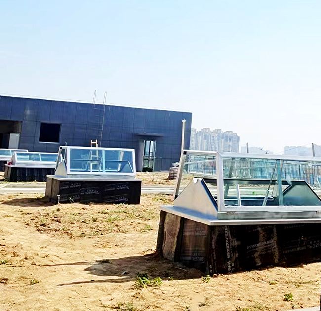 天窗外觀為三角形,天窗頂部可采用采光板或玻璃,有效增加室內(nèi)采光,且防水性好。開啟電機(jī)設(shè)計(jì)成24V安全電壓,可連接消防聯(lián)動(dòng)控制系統(tǒng)及風(fēng)、雨、煙感應(yīng)器。***開啟角度為60°。
