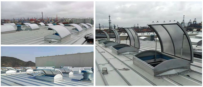 圓拱形的設計,外觀美觀大氣,能更好的防水,同時有效減少風壓阻力,天窗頂部為采光板,有效增加室內(nèi)亮度,開啟電機設計成24V電壓,可連接消防聯(lián)動控制系統(tǒng)及風、雨、煙感應器。***開啟角度為45°。