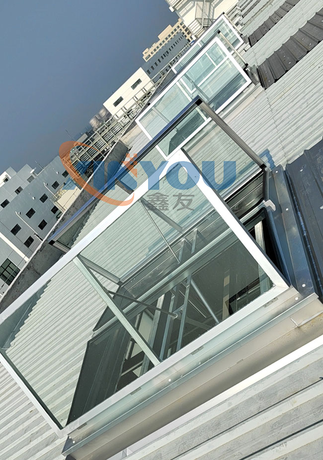 外觀為三角形,頂部為采光板,有效增加室內采光,且防水性好。開啟電機設計成24V安全電壓,可連接消防聯動控制系統及風、雨、煙感應器。***開啟角度為60°。
